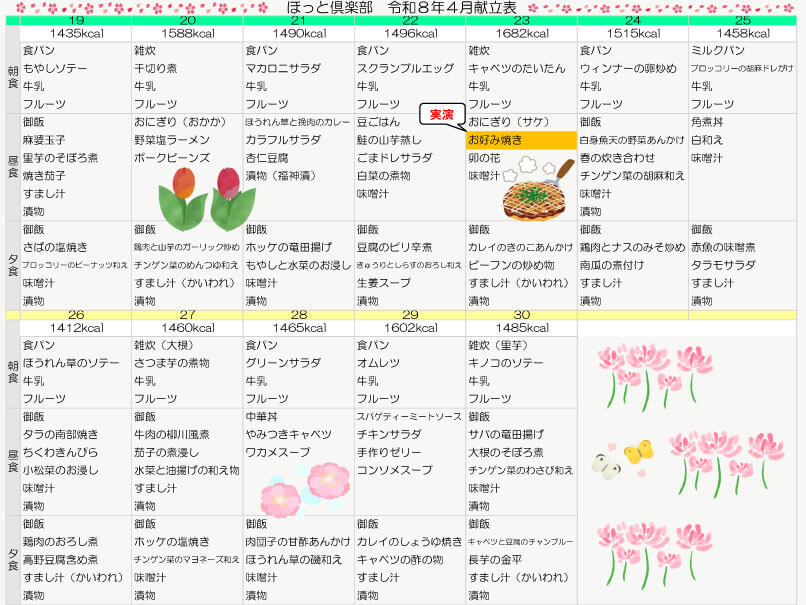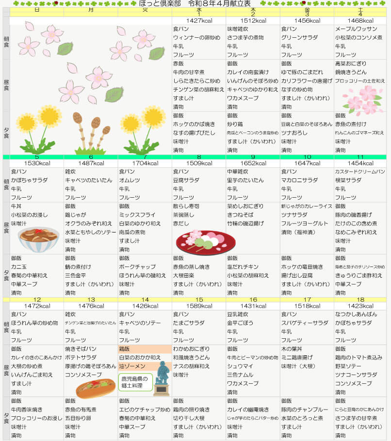 令和8年4月の献立では、春らしい食材を取り入れながら、