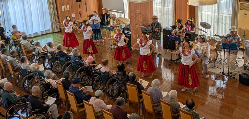 令和7年9月27日(土)、当ホームにて「すずめダンサーズ」の皆様をお招きし、フラダンスと合唱のイベントを開催いたしました。 当日はダンサー5名、演奏者6名という大人数でのステージ。迫力ある生演奏に合わせ、華やかでありながらも品格漂うフラダンスが... -